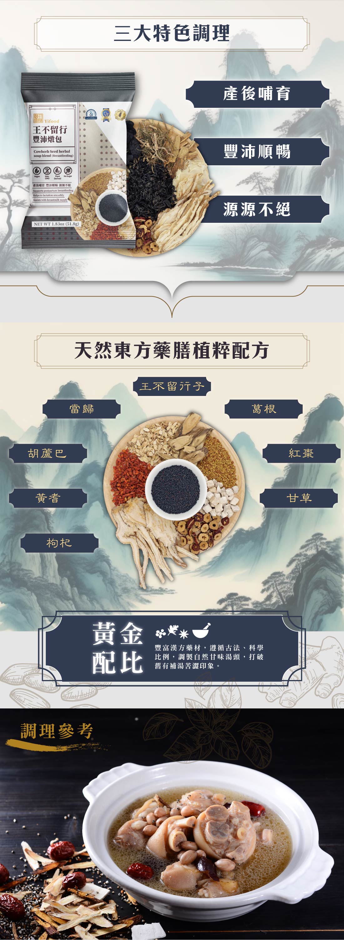 ■ 產品成份:(炒)王不留行、當歸、葫蘆巴、葛根、紅棗、黃耆、甘草、枸杞