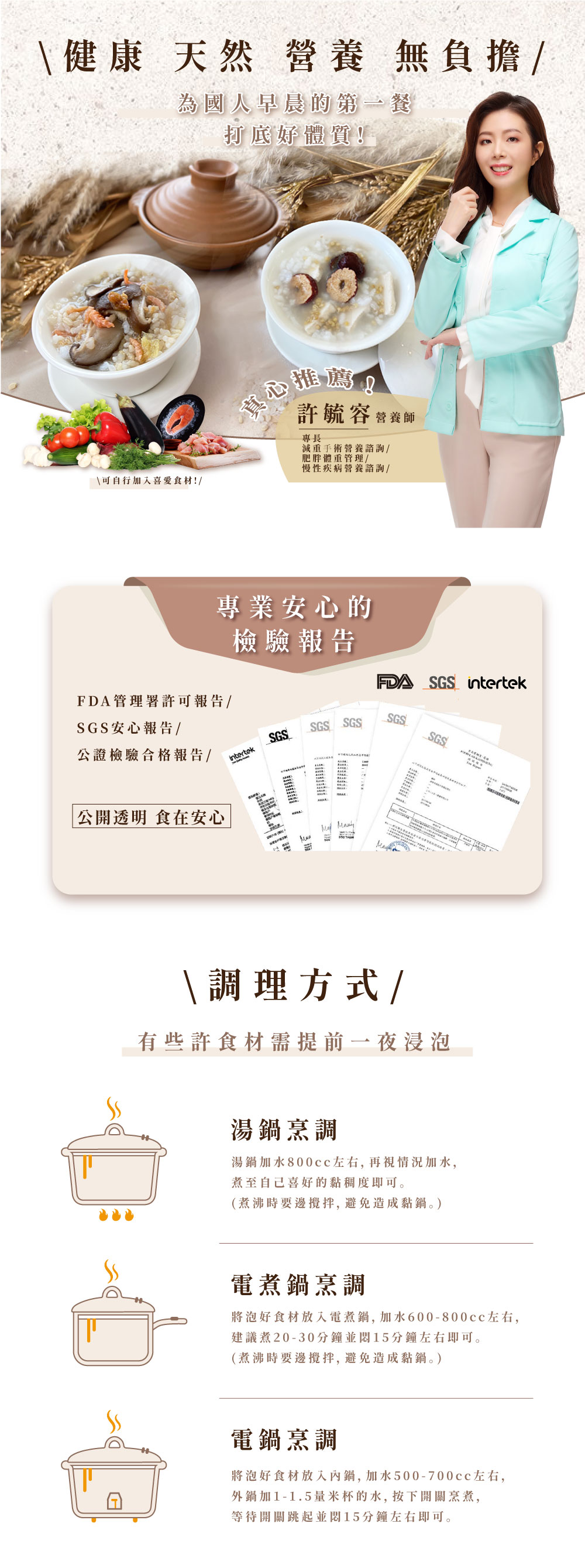 ■ 食用方法: 每份粥品為1人份,建議水量600c.c~800c.c.,建議小火慢煮20-30分鐘並悶 15分鐘左右。 (煮沸時要邊攪拌,避免造成黏鍋)